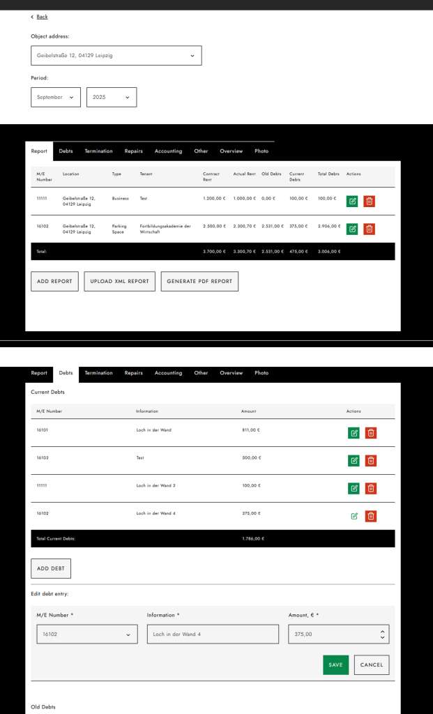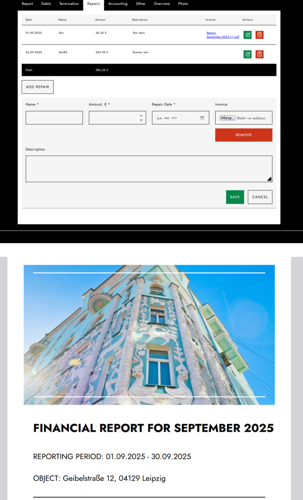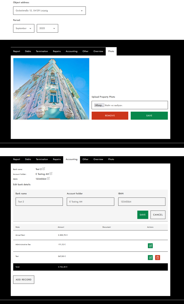 • Финансовый учёт и автоматизация: Мы внедрили автоматический расчёт доходов и расходов, учитывая платежи, долги и затраты на ремонт. Настроили импорт данных через XML-файлы с автоматическим распределением информации по соответствующим полям и объектам системы.